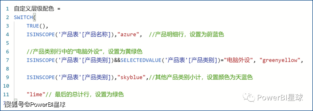 比如下面这个度量值,定义了每个层级显示的颜色: