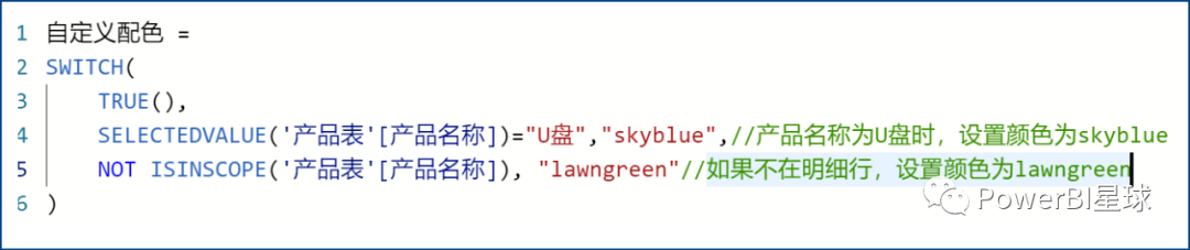 这个度量值同样是利用SWITCH和ISINSCOPE来判断上下文,来返回不同的颜色。