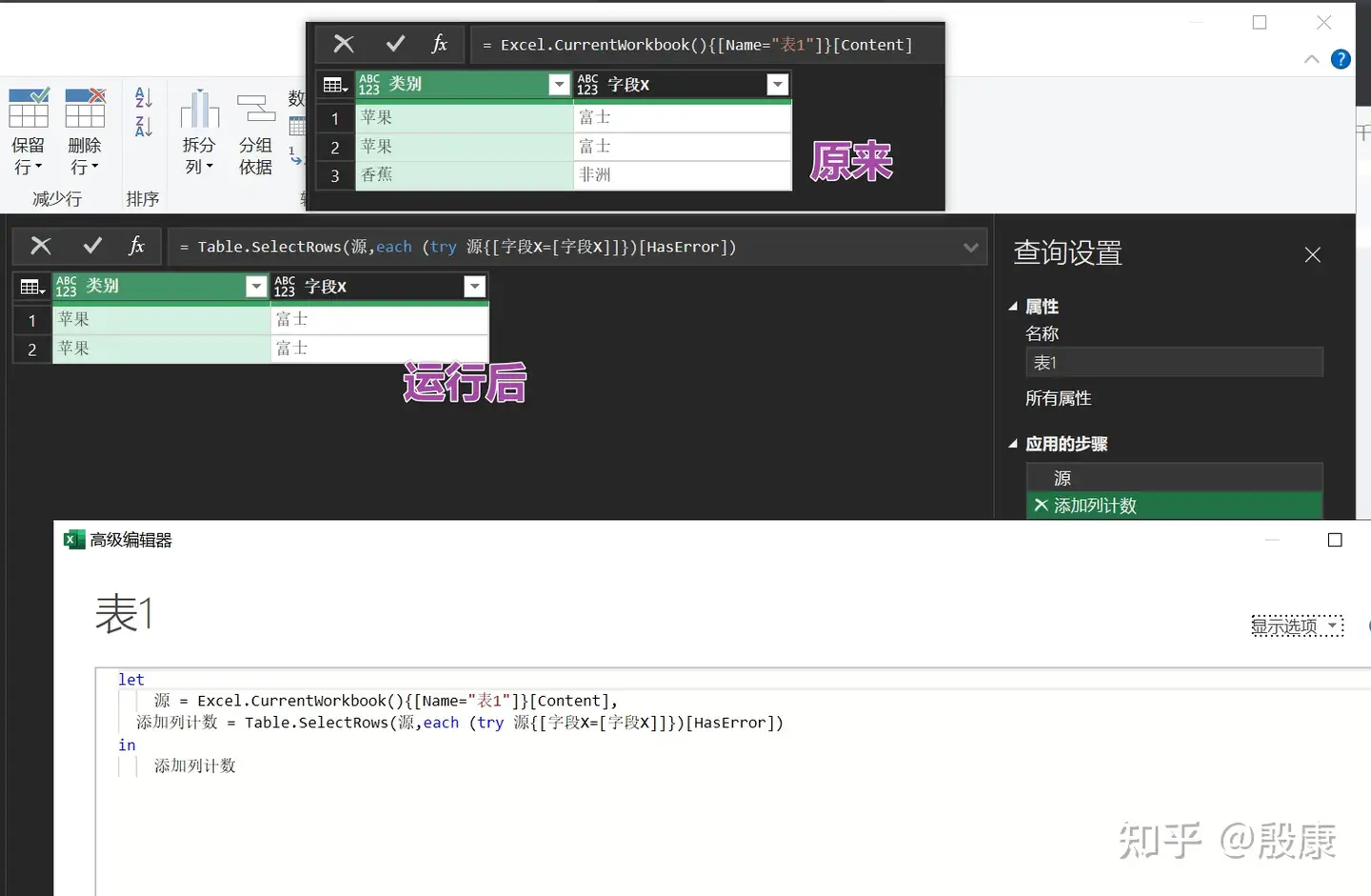 合并的查询 = Table.NestedJoin(源重复引用2, {"字段X"}, 分组的行, {"字段X"}, "字段X计数 ", JoinKind.LeftOuter),