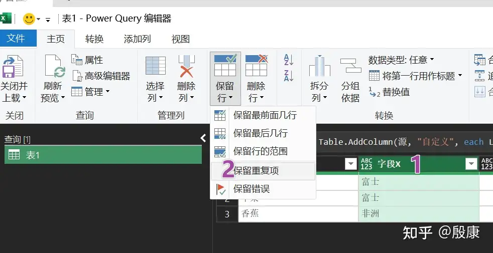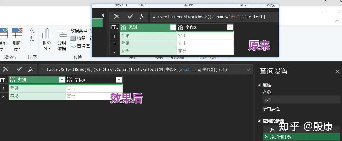 方法2, 保留重复列x = Table.SelectRows(上一个步骤名,(x)=>List.Count(List.Select (上一个步骤名[字段X],each _=x[字段X]))>1)
