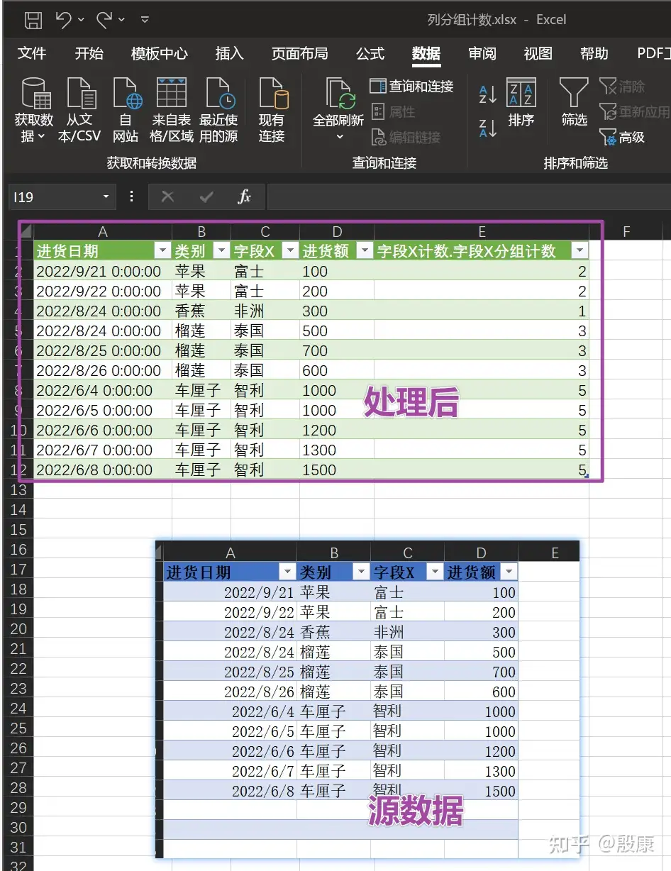 分组的行 = Table.Group(筛选的行, {"字段X"}, {{"字段X分组计数 ", each Table.RowCount(_), Int64.Type}}),