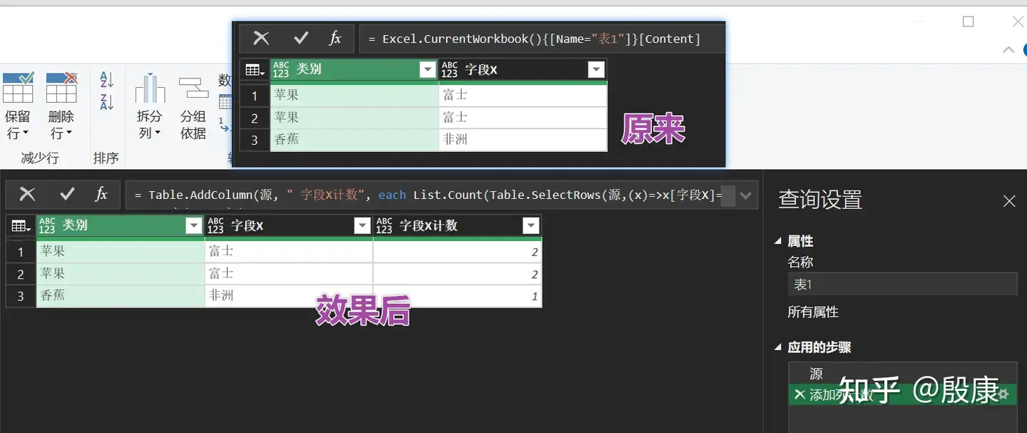 添加列计数 = Table.AddColumn(上一个步骤名, " 字段X计数", each List.Count(Table.SelectRows(源,(x)=>x[字段X]=[字段X])[字段X])),