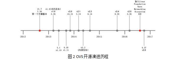 OVS项目的开源发展历史: OVS项目早在2009年,就已孵化诞生,于2012年7月30日发布第一个开源版本V1.7.0,经过这几年的不断发展壮大,到目前为止,OVS开源版本已经更新到V2.6.0。图2简单展示了其开源版本的更新历程。