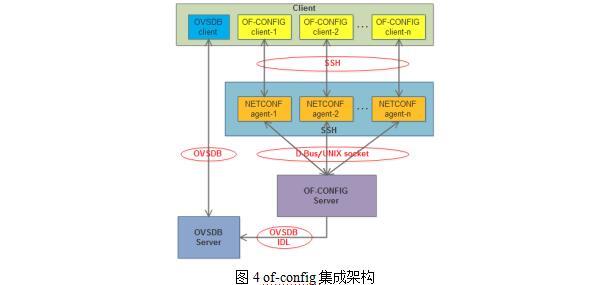 图4显示了OF-CONFIG对接OVS的架构实现,OF-CONFIG server作为一个系统守护进程,和OVSDB server之间通过OVSDB IDL(Interface Definition Language)建立连接。 然后OF-CONFIG server等待来自NETCONF agent的会话连接请求,一个NETCONF会话连接请求对应一个NETCONF agent。NETCONF agent在启动的时候和OF-CONFIG server建立连接, 并和OF-CONFIG client完成会话建立的握手。OF-CONFIG server和OF-CONFIG client之间通过D-BUS或UNIX socket方式的进行内部通信。