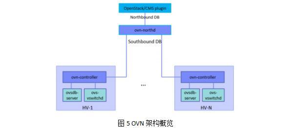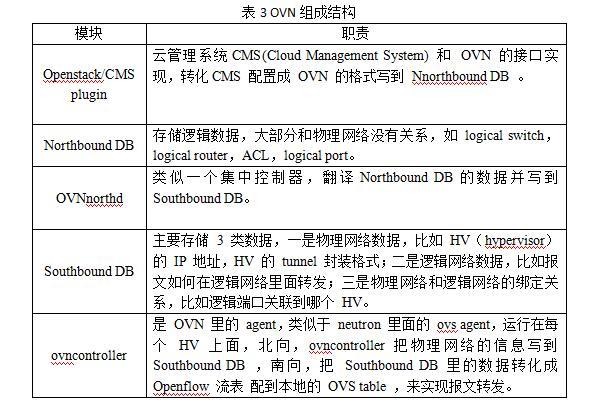 其次,了解OVN组成结构: 图5描述了OVN的总体实现架构,结合表3的描述,我们可以简单了解OVN的每个组件的基本功能实现。