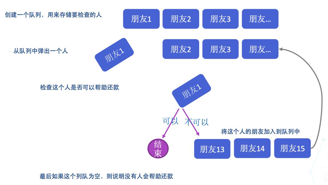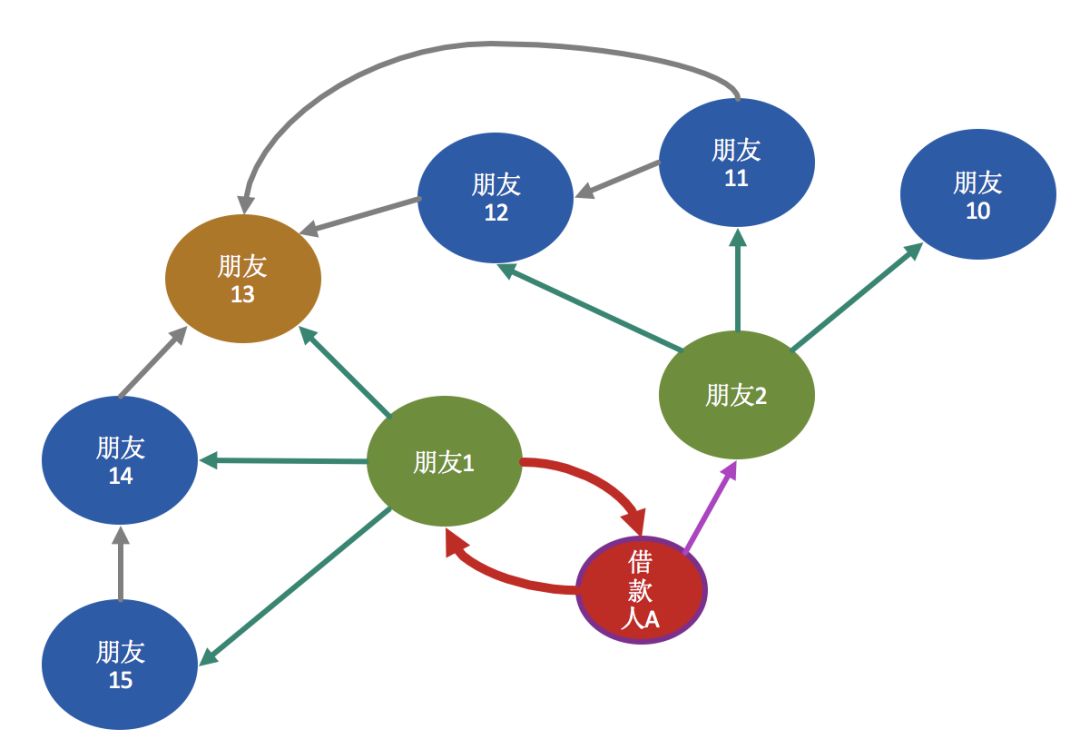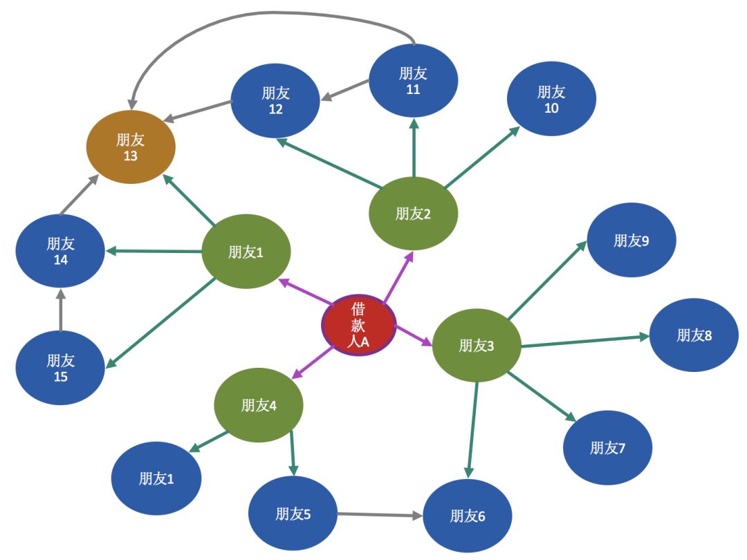 金融场景下,借款人A到平台借款,逾期未还,假定我们知道他的朋友中(朋友13)会帮助他还,这个例子可能不是特别的恰当,但可以帮助大家说明问题,并深入理解广度优先搜索
