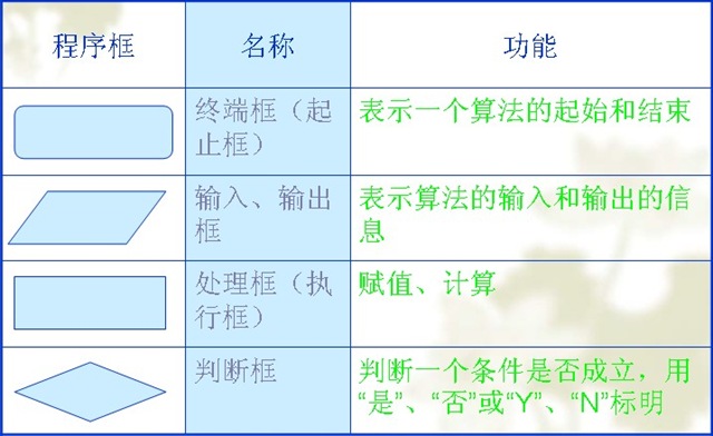 程序框图中,圆角长方形表示起、止框,平行四边形表示输入、输出框,长方形表示处理框、执行框,用于赋值、计算,菱形表示判断框,成立写是或Y,不成立则写否或N。