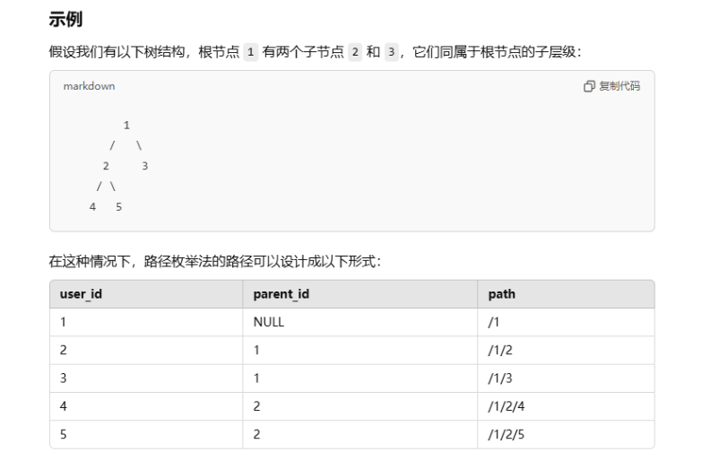 parent_id建立父子关系,同时每个节点存储路径path,例如/1/3/7。 - 优点:可以快速查询祖先路径和完整子树。