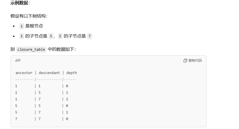 - 缺点:插入和更新操作较复杂,因为每次变动需要更新闭包表的多条记录。相对于路径枚举法没那么直观,数据维护相对多一点。基本上等同于路径枚举法。