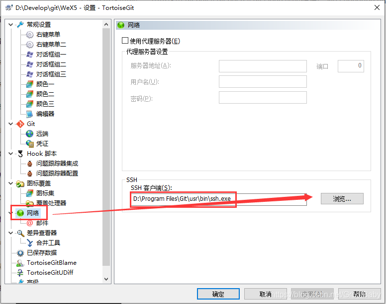 右键 -- 小乌龟 -- 设置 -- 网络 -- SSH 客户端为 git 的 ssh.exe