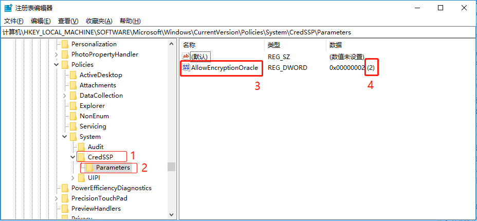 如果你的注册表到system之后就没有下面2个CredSSP和Parameters文件夹,就要你自己新建一个 CredSSP文件夹(如下图1处标识),然后在其下面再新建一个文件夹 Parameters(如下图2处标识),然后在其下面再新建 DWORD类型的 AllowEncryptionOracle(如下图3处标识),值为2(如下图4处标识)。