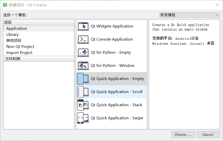 在Qt中,使用qml开发在新建项目界面需选择qt quick,如图