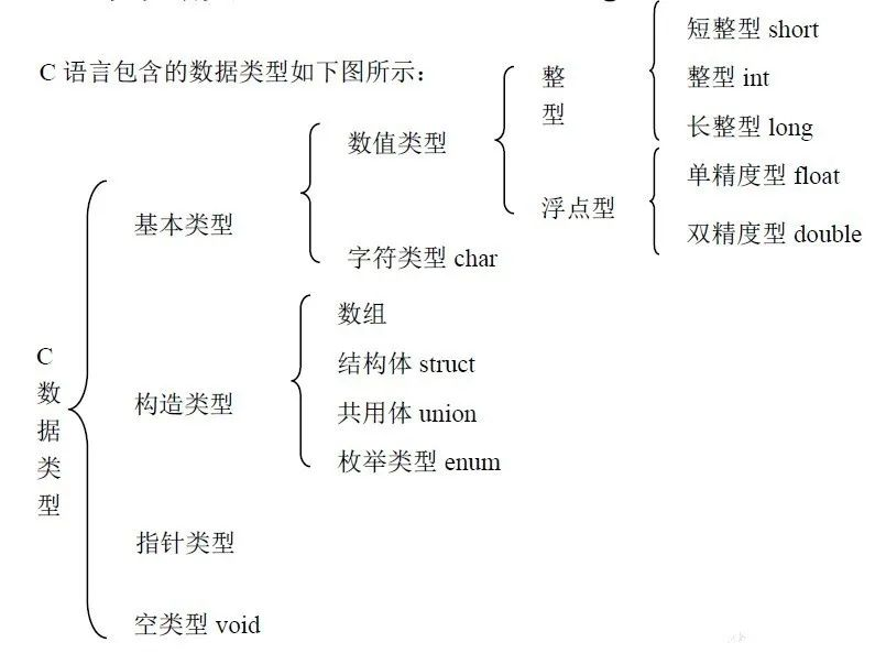 在c语言中,数据类型分为基本类型(int、double、float、short、long、char)和构造类型(数组,结构体,共用体和枚举)。