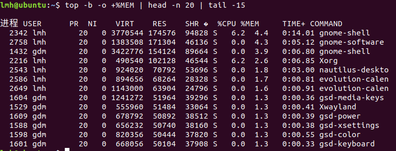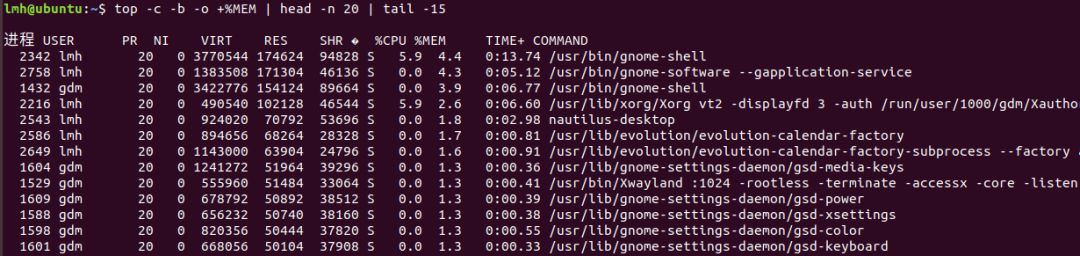 top -c -b -o +%MEM | head -n 20 | tail -15
