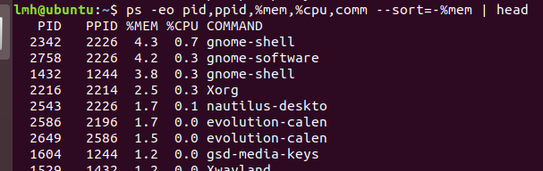 ps -eo pid,ppid,%mem,%cpu,comm --sort=-%mem | head