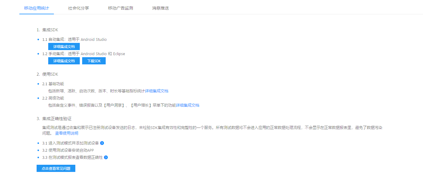 注册友盟账号新建应用这里就不多说了。这里都有详细的接入文档,记录方便日后所需。