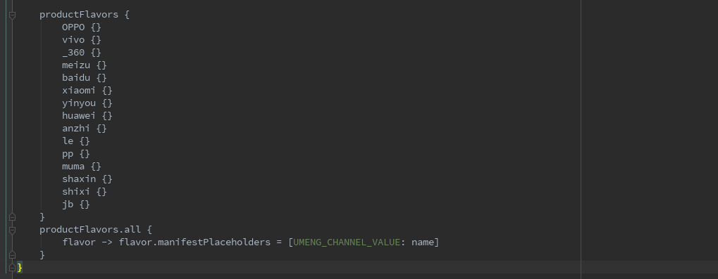 flavor -> flavor.manifestPlaceholders = [UMENG_CHANNEL_VALUE: name]