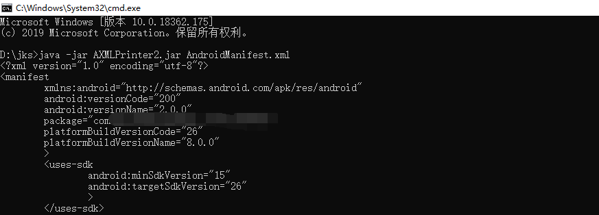 解压xxx.apk,选择AndroidManifest.xml(也可选择其它xml文件,不过xml文件都是乱码),复制到AXMLPrinter2.jar所在目录(同一级),