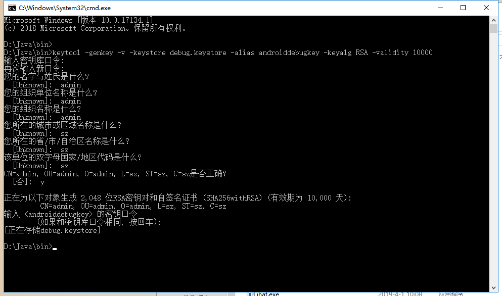 2.输入 keytool -genkey -v -keystore debug.keystore -alias androiddebugkey -keyalg RSA -validity 10000