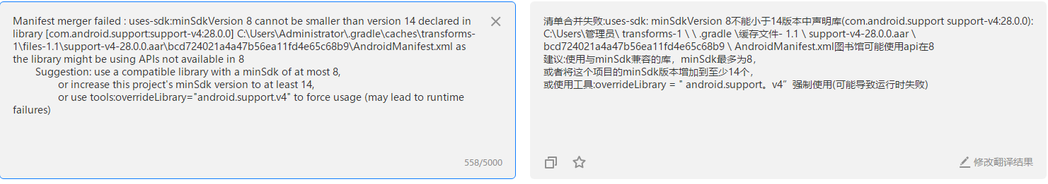 Manifest merger failed : uses-sdk:minSdkVersion 8 cannot be smaller than version 14 declared in library [com.android.support:support-v4:28.0.0] C:\Users\Administrator\.gradle\caches\transforms-1\files-1.1\support-v4-28.0.0.aar\bcd724021a4a47b56ea11fd4e65c68b9\AndroidManifest.xml as the library might be using APIs not available in 8