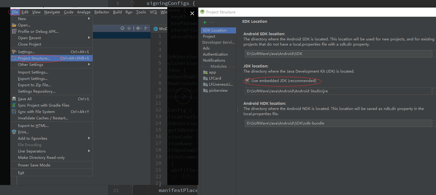 点击Android Studio的File->project structure,然后勾选jdk的use embedded jdk选项,如下图:**
