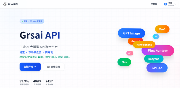 2025杀出来的黑马Api聚合平台——GrsAi(grsai.com)作为领先的API聚合服务平台,提供低价AI 大模型API具有超强的稳定性,为企业独立开发提供便宜稳定的调用服务。GrsAi日调用量50w+,服务2000+独立开发者的网站和企业大型产品,拥有多款AI大模型接口资源,价格便宜,稳定性强,支持高并发。
