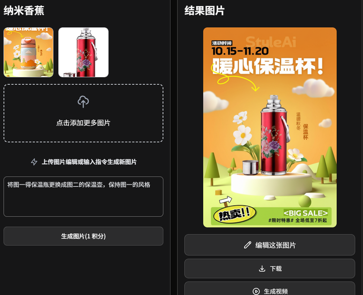 提示词:将图一的保温瓶更换成图二的保温壶,保持图一的风格