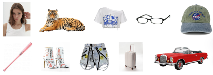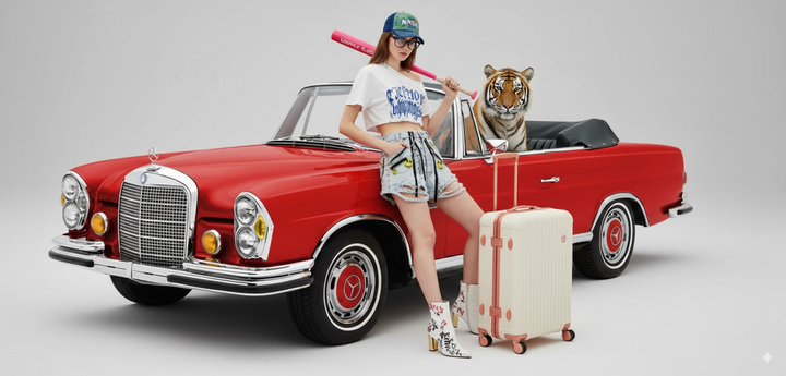 提示词:一位时尚模特靠在一辆复古红色敞篷车旁,场景为高级浅灰色工作室。她穿着白色上衣、浅色牛仔短裤(点缀笑脸图案和黑色链条),戴着黑框眼镜,脚踩涂鸦风格短靴。模特头戴NASA棒球帽,手中握着一根粉色棒球棒,身边放着一个米白色行李箱。最后老虎在复古红色敞篷车的驾驶位上当司机。