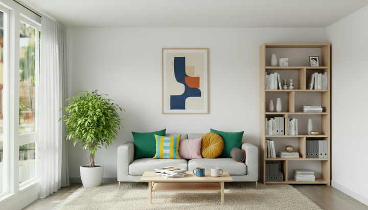 提示词:在沙发背景墙上挂一幅极简抽象画作,沙发上摆放几只彩色抱枕,茶几上放杂志和陶瓷马克杯