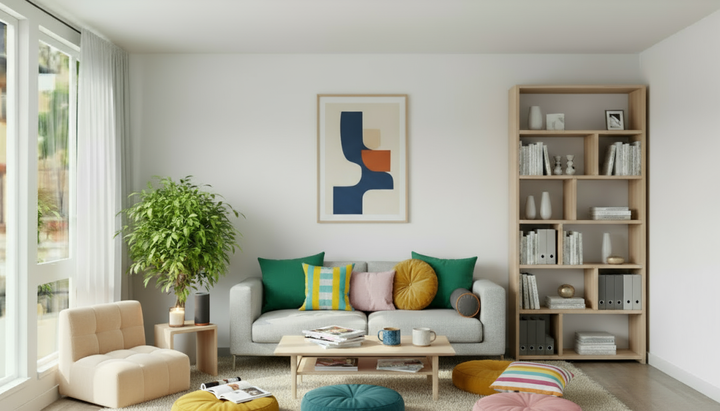 提示词:在沙发对面靠窗角落放一张小巧懒人沙发或单人休闲椅,适合阅读和休憩,墙角放置一台音响或蓝牙音箱,地毯一侧增加几个不同颜色的圆形坐垫;地上可摆设几本杂志或一个香薰蜡烛