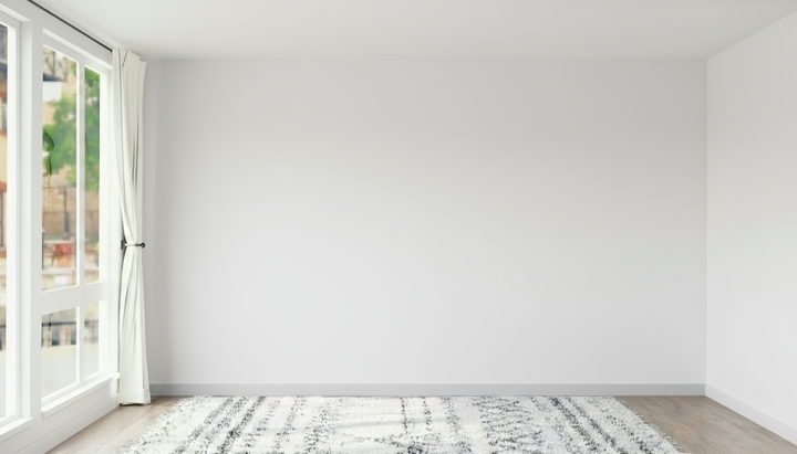 提示词:在房间地面中央铺一块大面积米色地毯,并为落地窗增加一层浅灰色纱帘;在地毯上摆放一张现代风格的浅灰色双人沙发和一个原木色小茶几
