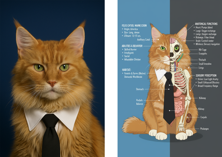 提示词:Draw a bilaterally symmetrical frontal anatomical illustration of the cat, styled similarly to an infographic. The image should show the creature's external features on both sides, with its internal anatomy partially exposed. Detailed text should flank the image, explaining the creature's biology, abilities, behavior, habitat, and the specific functions of its anatomical structures. The overall design should be clear, informative, and in the style of a scientific illustration.