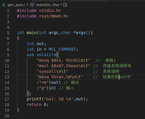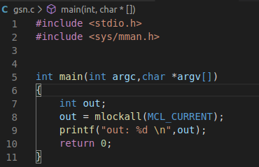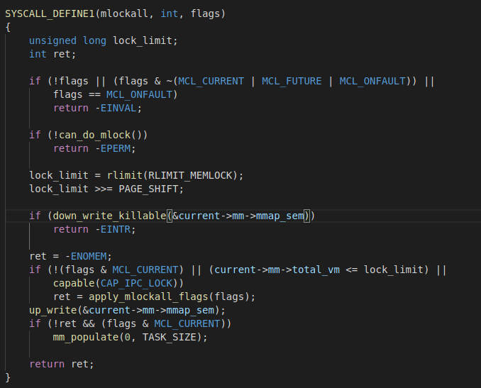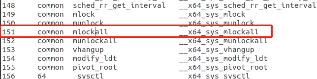 系统调用 mlockall,函数入口为 __x64_sys_mlockall。编写程序调用mlockall: