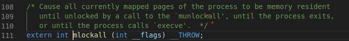 这个系统调用接受一个参数;如果指定 MCL_CURRENT,则仅仅当前已分配的内存会被锁定,之后分配的内存则不会;MCL_FUTURE 则会锁定之后分配的所有内存。使用 MCL_CURRENT|MCL_FUTURE 将已经及将来分配的所有内存锁定在物理内存中。