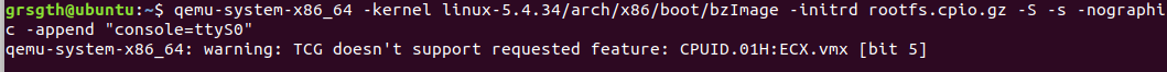 qemu-system-x86_64 -kernel linux-5.4.34/arch/x86/boot/bzImage -initrd rootfs.cpio.gz -S -s -nographic -append "console=ttyS0"