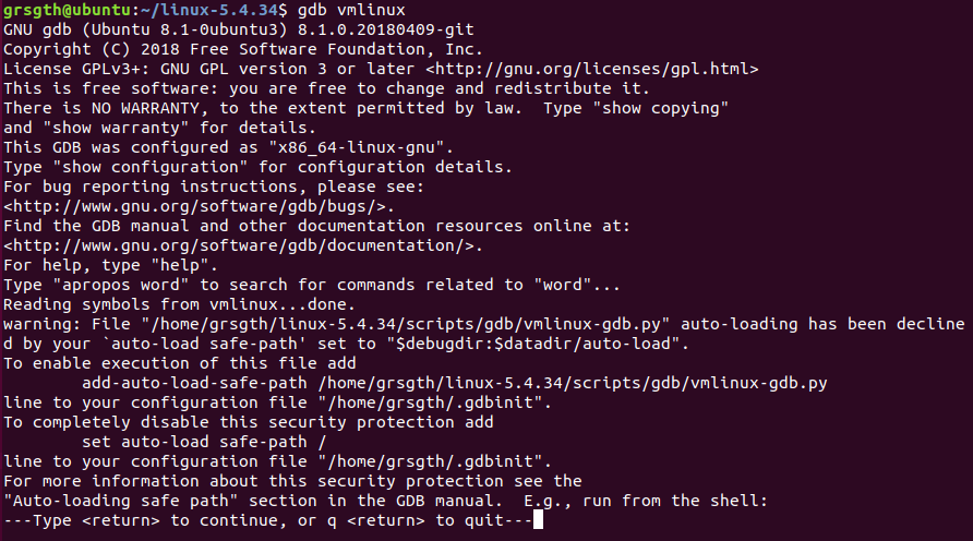 在另一个terminal中开启gdb调试 gdb vmlinux: