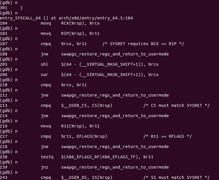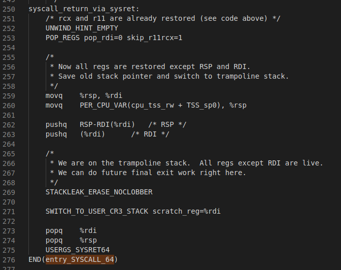 3.查看entry_syscall_64后续的代码,在完成执行现场的恢复,最后的两个popq出栈指令恢复原 rdi 和 rsp的内容,也就是完成了堆栈的切换。
