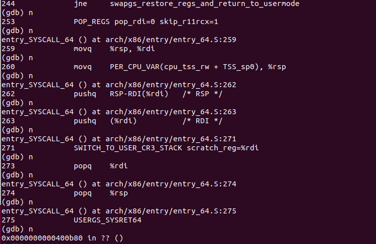 继续执行,再次回到了函数堆栈的上一层,entry_SYSCALL_64 ,接下来执行的是用于恢复现场的汇编指令,最后随着两个popq出栈指令,恢复了rdi和rsp寄存器,系统调用完成