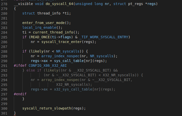2.然后跳转到了/linux-5.4.34/arch/x86/entry/common.c 目录下的 do_syscall_64 函数,在ax寄存器中获取到系统调用号,然后去执行系统调用内容: