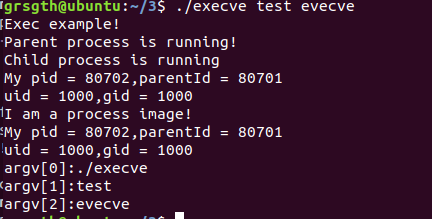 从执行的结果中可以看出,新进程保持了原来进程的ID,父进程ID,实际用户ID,实际组ID。同时我们还可以发现当调用新的程序后,原有的子程序的镜像被替代,不被执行了。