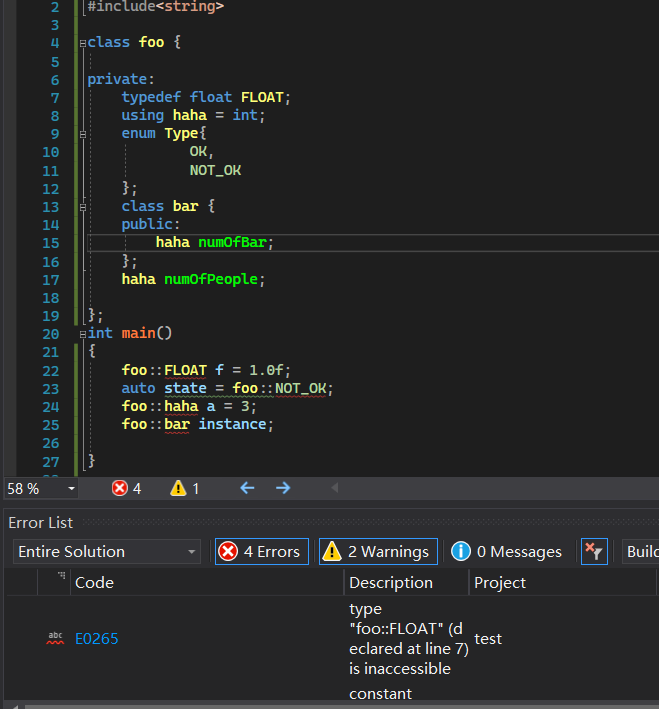 如下所示:如果在 foo 里、定义类型别名、枚举、内部类、并且它们都处于public范围内、那么外部是可以用