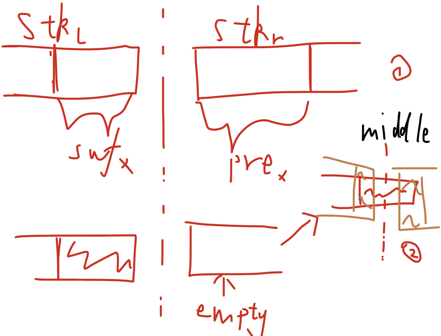 考虑对 \(r\) 做扫描线,我们 不妨设 \(x\) 在 \(mid\) 右边,对于使得后缀的那个 \(\mathrm{max}\) 相同的 \(x\) 一定取更小的 \(x\)(这样前缀 \(\mathrm{min}\) 最大),所以如果维护一个单调栈,那么答案的 \(x\) 一定在栈里面的位置取。