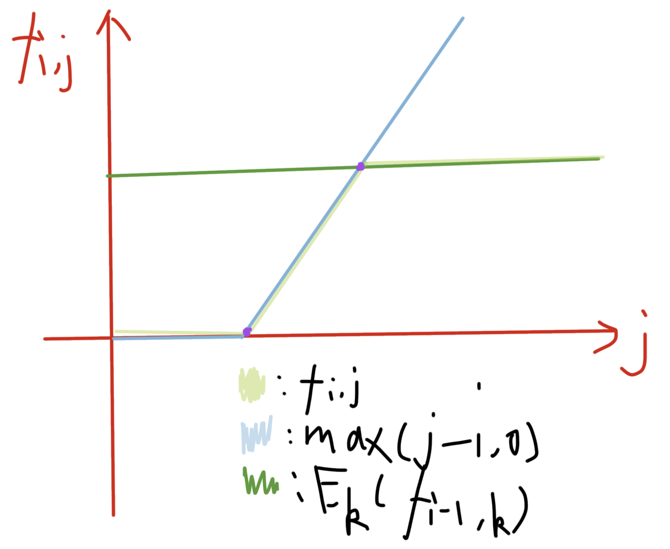 如图,我们用两个紫色点就能描述 \(f_{i,j}\) 当 \(i\) 固定时的所有值。转移也是十分的简单,把此时的描述方法映射到原来的转移里面即可。