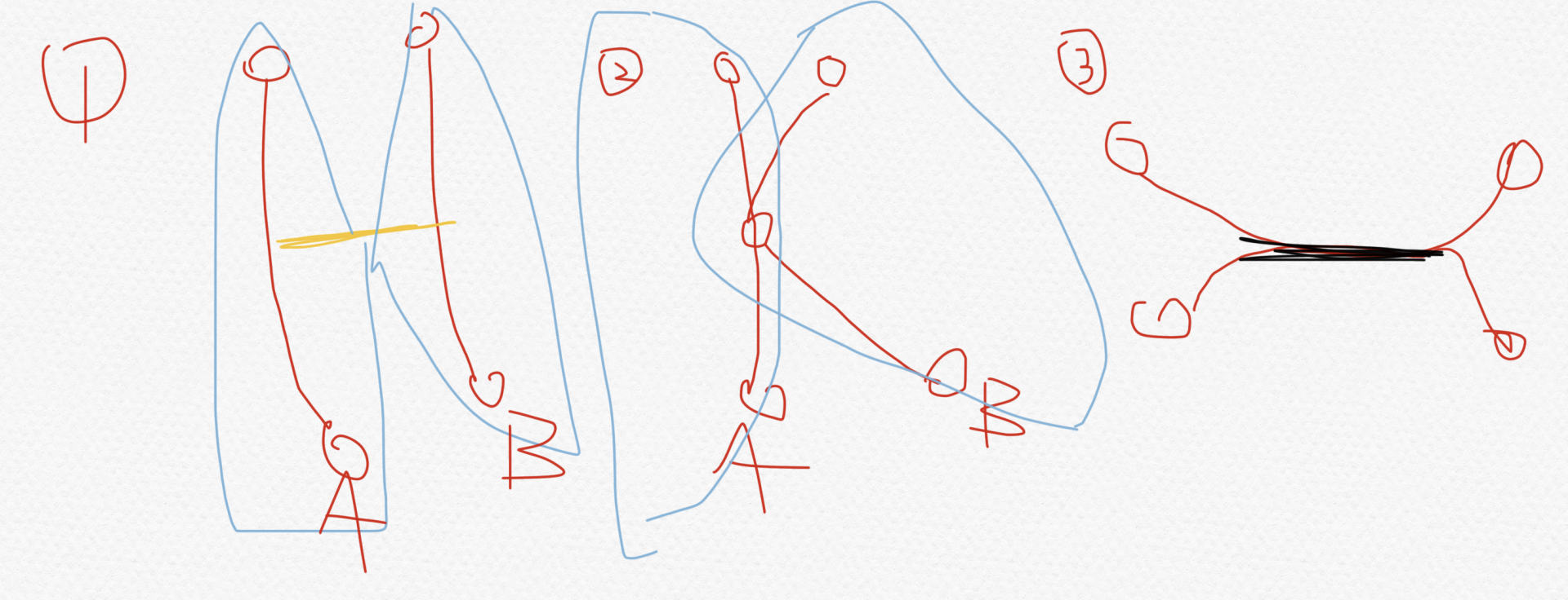 蓝色圈表示树的划分,黄色表示连接两个链的一串边,黑色表示两条链的边交。