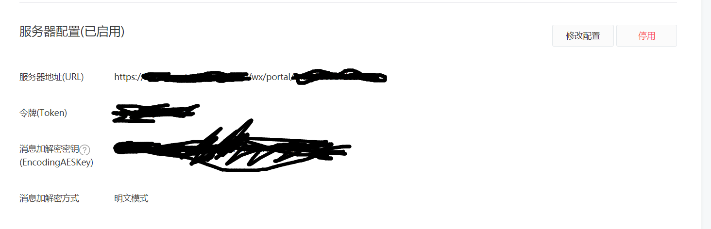 - 公众号开发配置,服务器URL就是刚才WxPortalController的接口,验证消息来自微信,接通公众号。也是公众号交互,事件推送的唯一入口。