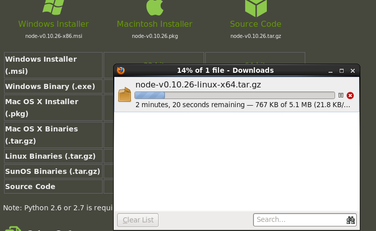 2、首先下载NodeJS的二进制文件,http://nodejs.org/download/。在 Linux Binaries (.tar.gz)行处根据自己系统的位数选择