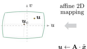 步骤2:通过仿射变换\(\mathbf{A}\)将归一化坐标\(\pmb{x}\)映射到传感器坐标\(\pmb{u}=(u, v)^{\top}\)(见式(14)):