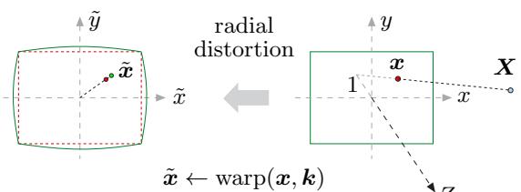 因此(见式(25)),畸变后的投影点为\(\tilde{\pmb{x}}_i = \mathrm{warp}(\pmb{x}_i,\pmb{k})\),其中