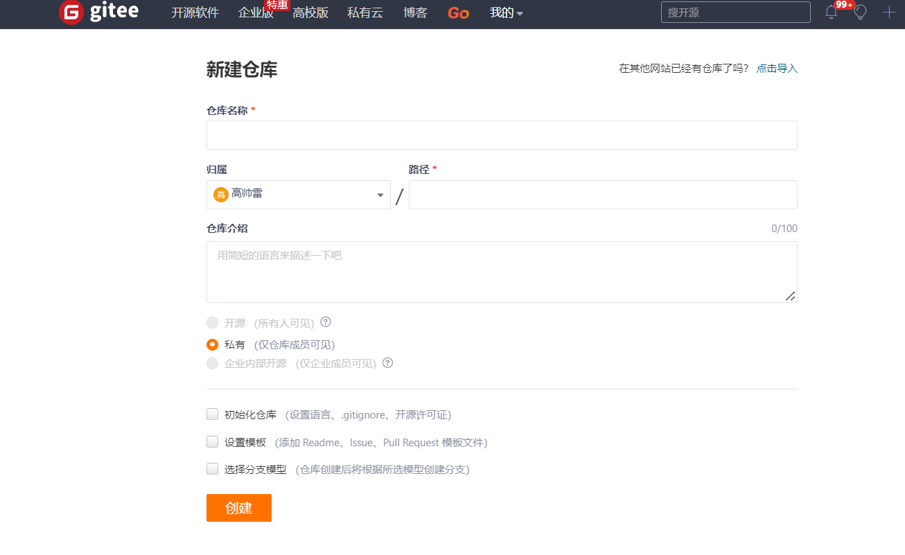 1、在代码托管平台网站新建仓库,获取代码仓库的连接,如 :https://gitee.com/xxxx/test-git.git