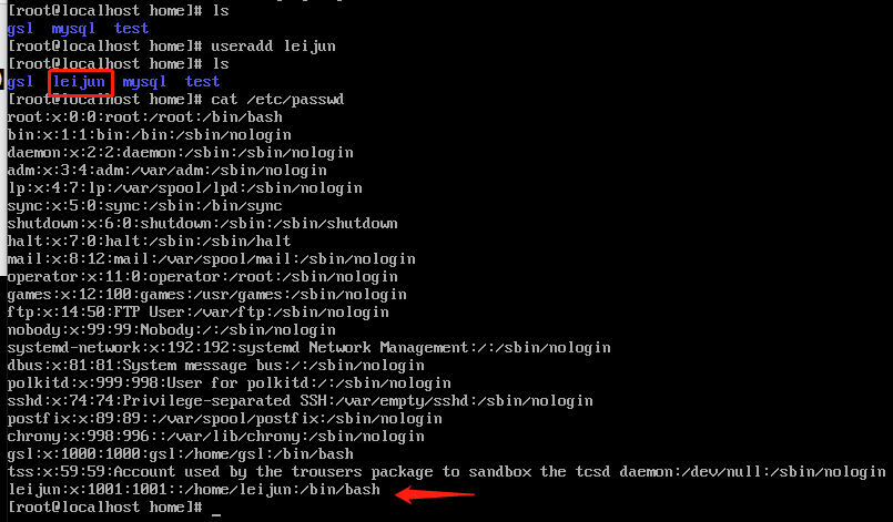 useradd leijun : 创建用户,经过实验,发现带不带-m其实没有区别